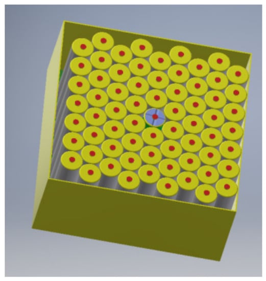 Based on experience, it was decided that as the power source for the PCA-1 battery vehicles, a lithium-iron-phosphate battery will be selected. It was composed of cells connected in series to provide the voltage level of 48 V DC. The battery units of resultant energy of 150 kWh were predicted to be housed inside a special box for protection. However, in closed housing, the cooling conditions significantly deteriorated. This was unfavorable, particularly when the cells that make up the batteries are packed tightly (as seen in Figure 3). The cells located centrally will be the most at risk since they are additionally heated by the surrounding cells.