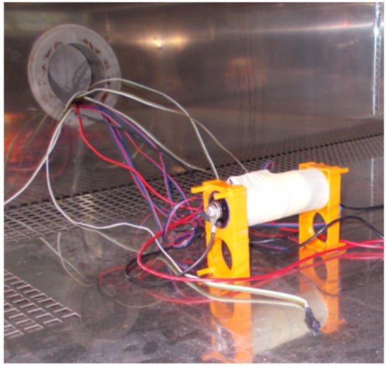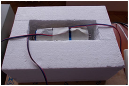 For a fixed humidity equal to 75%, the ambient temperature was stepwise adjustable in the range from +5 °C to +60 °C. The load current was selected to be 3.8 A, which is around 40% of the standard discharge value. The influence of deteriorated cell cooling was examined in simulated conditions by wrapping the cell’s casing with appropriate thermal insulation and placing the whole in a styrofoam housing, as indicated in Figure 6.