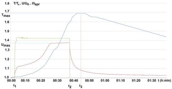 The temperature (T1 sensor-blue line), load current (green line, Ispr is a standard discharge current equal to 10 A), and cell (LiFePO4) voltage U/Un (red line) variation as a function of time during the overcharging (voltage Umax over 37%) (rated Un = 3.2 V, ambient temperature T0 = 22 °C, t1, t2—time of switching the charger on and off, t3—time of the maximum temperature Tmax = 37 °C).