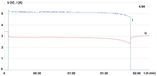 It is obvious that under real working conditions, the cells may be loaded with different current values depending on the nature of the work. Therefore, variation with time of the cell voltage value and the course of heating may be of a very different nature during operation. The cells were fully charged, and the tests continued until the voltage dropped to the minimum value (2.5 V). During loading, the current was practically constant over time (regardless of the set values) and started to drop down when the voltage decreased to a value close to its minimum (Umin = 2.5 V). For the load current equal to 4.9 A, this is shown, for example, in Figure 8.