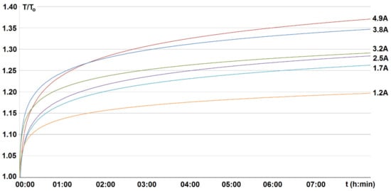 Increase in cell temperature T (T1 sensor) during discharge (to the minimum voltage value Umin equal to 2.5 V) for various load currents under free room conditions. (T0 = 22 °C).
