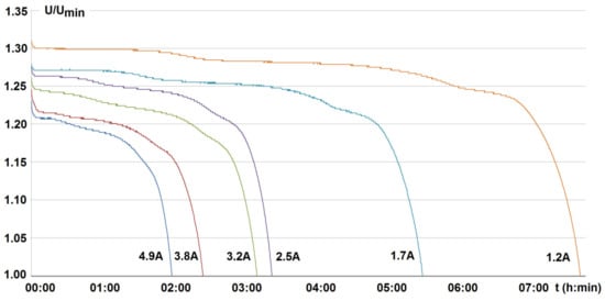 Variation of cell voltage U with time versus the load current (1.2–4.9 A) for a constant ambient temperature (about 22 °C). Umin = 2.5 V.
