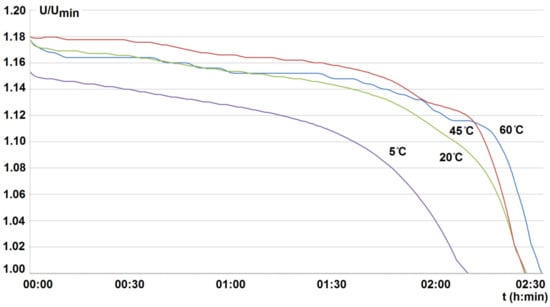 The research shows that increasing the cell temperature (up to about +60 °C) practically does not affect the duration of its discharge. On the other hand, it is much more unfavorable for decreased casing temperature (+5 °C), which shortens as a result of the duration of the discharge time (by about 10%) to the voltage minimum value (see Figure 11).