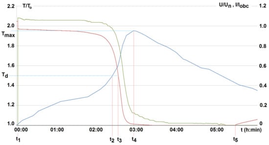 Variation of voltage U (red line), current I (green line ), and temperature value (blue line, T1) of a cell with time during deep discharge (to around 10% of rated voltage value Un) for a constant load current Iobc of 3.8 A; (room temperature T0 = 22 °C, free cooling; t1,t5—moment of switching on and off the load current respectively, t2—temperature Td (33 °C) at the minimum voltage value recorded at t3; t4-time of maximum temperature Tmax (43 °C)).