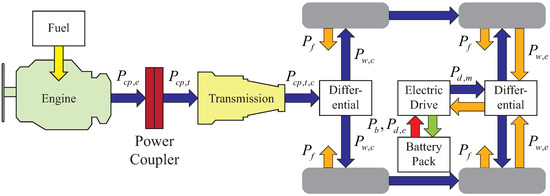 where is the angular velocity of the axle shafts, is the wheel radius, is the final drive ratio between the CP and axle, is the final drive ratio between the EP and axle, , and and are appropriate matrices needed for the control formulation in Section 3. All vehicle parameters are listed in Table A4 in Appendix A.