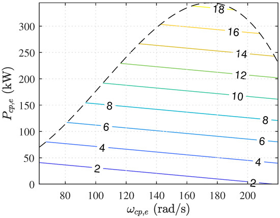 where is the motor shaft angular speed, is the inverter efficiency, captures the field weakening above the rated speed rad/s, and are motor-parameter-derived constants, is a regularization term to prevent division by zero at zero speed and/or zero mechanical power, and regulates the maximum mechanical power, given in Equation (A1) in Appendix A, in motoring and generating, respectively. The rated speed denotes the separation point in motor control: below the rated speed, the motor operates under field-oriented control with the maximum power set by the stator current limit and above the rated speed, the motor operates under field-weakening control where the maximum power begins to decrease linearly after rad/s due to a maximum voltage limit.