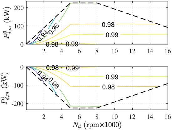 Electric drive system motor propelling electrical to mechanical power conversion efficiency contours (upper) and generating mechanical to electrical power conversion efficiency contours (lower) without the inclusion of inverter efficiency: (--) mechanical power limit.