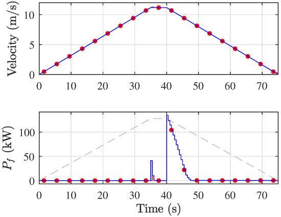 subject to Equations (21)–(23) and convex and compact variable bounds where weighs the deviation of the tracking from the reference , and weighs the use of friction braking to make regenerative braking preferred.
