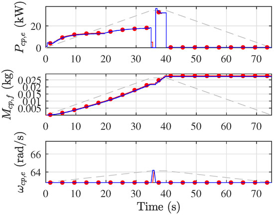 15L-H truck tractor electric drive system electrical power (upper) and mechanical power (lower) over the trapezoidal driving cycle: (––) POCP value, (●) EOCP value, (--) superimposed drive cycle.