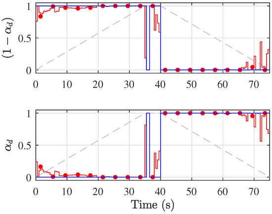 The EDS and battery are both switched components and have control problems that include discrete-valued mode switches. To avoid the computational complexity associated with discrete-valued mode switches [20], the embedding method is applied, where are relaxed to , i.e., replaced with . The resulting problems with all continuous-valued variables are embedded optimal control problems (EOCPs). If an EOCP solution results in any , then the embedded solution must be projected back to , and the projected optimal control problem (POCP) must be solved to obtain the control inputs to be applied. Here the projection utilizes the connection power values. For the EDS when , if , then the mode is propelling and generating otherwise. If projection is necessary, the distributed control is solved a second time with the projected mode values enforced. The optimal control problems formulated for the distributed solution meet the conditions for the existence of an EOCP solution and convergence of the distributed solution as outlined in [19,20].