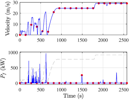 subject to Equations (1)–(6) and convex and compact variable bounds, where is the power management prediction horizon, is the current time, and weighs the fuel use penalty. We note that penalizing fuel use is equivalent to penalizing CO2 emissions as in [18].