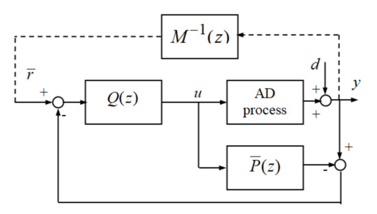 In conclusion, the data-based design of the Q ¯ ( z ) controller uses the data u ( t ) and the y ( t ) collected in open loop operation of the ADP at a given operating point, as well as the r ¯ ( t ) “reference” computed with Equation (4), after choosing a reference model. Therefore, the optimal parameters θ * obtained by minimizing the criterion given by Equation (5) are not affected by the colored noise y ( t ) y ¯ ( t ) . This noise is transmitted on the feedback pathway in closed loop operation when the controller input is u c ( t ) = r ( t ) y ( t ) y ¯ ( t ) , where r ( t ) is the setpoint of the IMC system.