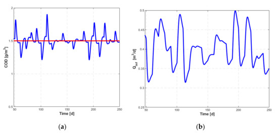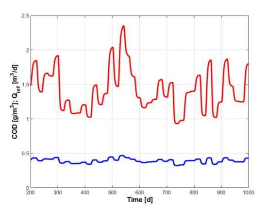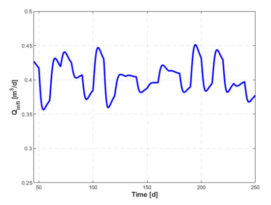 The rejection of disturbance was examined in relation to the variation of the influent C O D concentration ( C O D i n ( t ) ) presented in Figure 15. The evolution of the controlled variable, C O D , and of the setpoint, C O D r e f , are shown in Figure 16. A performance evaluation must also be made considering the evolution of the command variable, Q inf , shown in Figure 17. Its variations around the stationary value related to the current operating regime, Q inf ( t ) = 0.4   [ m 3 / d ] , are small enough, so that it can be appreciated that the hypothesis of linearizing the mathematical model of the process is valid. We can test and determine the maximum amplitude of the C O D i n disturbance that would cause a major deterioration of the control quality. Thus, if the amplitude of the C O D i n disturbance is doubled, then the results presented in Figure 16 and Figure 17 become those in Figure 18a,b, respectively. This shows that the quality of the control is not significantly affected, and the variation of the operating point in dynamic regime covers the interval [ 0.3 , , 0.5 ] where the nonlinearities are already significant.