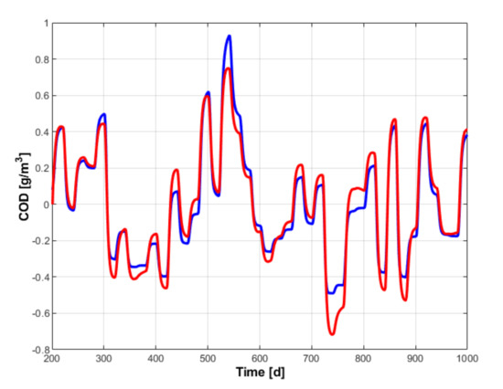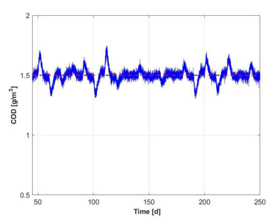 The effect of a measurement noise with the standard deviation σ n = 0.233 on the controlled variable was tested. Under these conditions, the standard deviation of the controlled variable is σ C O D = 0.0233 , and the evolution of this variable is given in Figure 22.