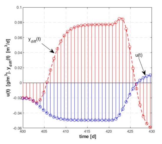 The initial data, used to check the robust stability, came from the u ( t ) , y ( t ) t = 1 , N ¯ set, represented in Figure 1, which served to synthesize the command law. These data were extracted using the sampling period T s = 0.01   [ d ] , resulting in N = 80 , 000 samples. Obviously, this number is prohibitive in the ETFE calculation procedure. Consequently, a new data set with N 1 = 1000 samples was extracted from the initial data, with the sampling period T s 1 = 0.8   [ d ] . Figure 12 shows a zoom of the data set which includes the signals u ( t ) and y d i f f ( t ) with the sampling period T s , represented in blue and red dashed line, respectively, as well as the impulses from those signals extracted with the T s 1 sampling period.