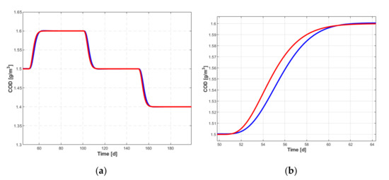 Figure 14. Setpoint tracking: setpoint C O D r e f (red), controlled variable ( C O D —blue) (a); zoom (b).