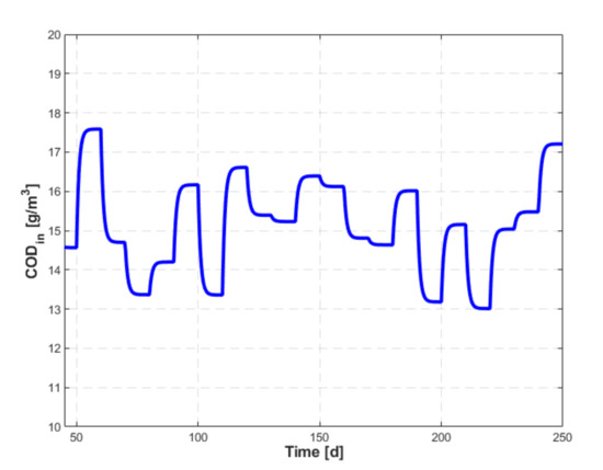 The anaerobic digester (AD) used in the case study presented in this paper has a volume of liquid V l = 3400   m 3 and a volume of gas V g = 300   m 3 . The digester is considered well-mixed and the temperature in the digester is controlled at an optimal value. The ADM1 model, which has 35 state variables, was implemented in accordance with [28]. The objective of the control problem is to track the chemical oxygen demand (COD) concentration at a setpoint compatible with environmental norms. This is defined by the relation C O D = S 1 + S 2 , where S 1 is the sum of the concentrations of the organic substrate components, and S 2 is the sum of the volatile fatty acid concentrations [7]. The command variable is the dilution rate D (or the influent flow rate in AD, Q inf = V l D ), and the disturbance variables are the concentration variations in the influent, S 1 i n and S 2 i n .