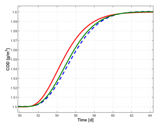 Analysis by numerical simulation of the performances of the synthesized control law follows three aspects: (1) following the setpoint C O D r e f ( t ) ; (2) the rejection of the disturbance C O D i n ( t ) and (3) the effect of the measurement noise on the controlled variable.
