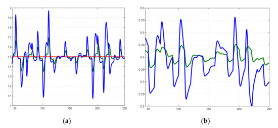 Figure 20. (a) Evolution of the controlled variable, and (b) the command variable for ω ˜ = 3.5   [ r a d / d ] . The respective variable from the reference situation is represented with a green line (see Figure 16 and Figure 17).