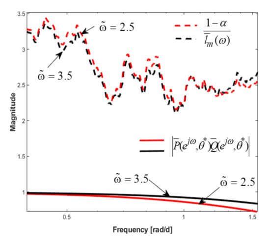 Figure 21 shows the functions 1 α l ¯ m ( ω ) and P ¯ ( e j ω , θ ) * Q ¯ ( e j ω , θ * ) , for ω ˜ = 2.5   [ r a d / d ] and ω ˜ = 3.5   [ r a d / d ] . It is found that by adopting the new reference, decrease in the stability margin is insignificant.