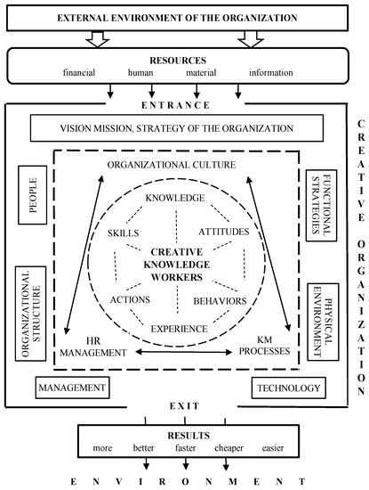Creative knowledge worker is at the center of the organization as the owner of potential (including, above all, knowledge), the development and use of which are crucial for the creative organization to achieve a high level of competitiveness on the creative sector market. To make this possible, the shape of the KM processes, the applied methods and tools of HRM, and the organizational culture must be conducive to the development and use of the potential of creative knowledge workers to achieve organizational goals of knowledge management. All elements of the internal organizational environment (people, organizational structures, functional strategies, etc.) relate to each other, shaping the broadly understood working conditions, which translates into the effectiveness of creative knowledge workers. On the other hand, through their decisions, actions, and effects of their work, they may, to a greater or lesser extent, shape this environment. Creative organizations take widely understood resources from the external environment, providing it in turn with the effects of their activities in the form of new (or improved) goods and services.