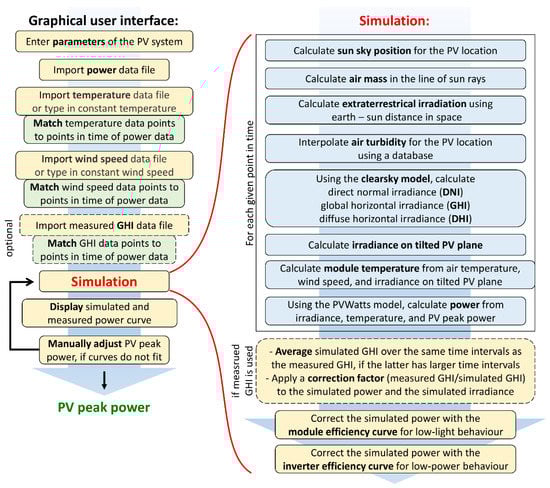 After importing the measured PV power as a function of time as obtained from the inverter, the simulated power curve is adjusted manually to the measured power curve by modifying the system peak power of the simulation. When comparing both power curves for that day, periods of shading and even short time periods with clouds are identified by eye, so that the overall fitting of the correct system peak power is not significantly disturbed. The outcome of this procedure is the actual system peak power.