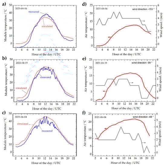 Left column (a–c): Simulated and measured module temperatures on three different days (date in the upper left corner). Right column (d–f): Air temperature, wind speed, and average wind direction angle relative to the azimuth of the PV modules between 9 h and 15 h UTC on corresponding days.