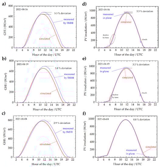Left column (a–c): Simulated and measured global horizontal irradiation (GHI) on three different days (date in the upper left corner). The measurement was done by a local weather station (Sveriges meteorologiska och hydrologiska institut, SMHI). Right column (d–f): Simulated and measured irradiation on corresponding days in the plane of the PV modules. The measurement was done using the above-named calibrated detector mounted directly near the PV modules. The simulations were done without shallow angle reflection correction (see Section 3.4).