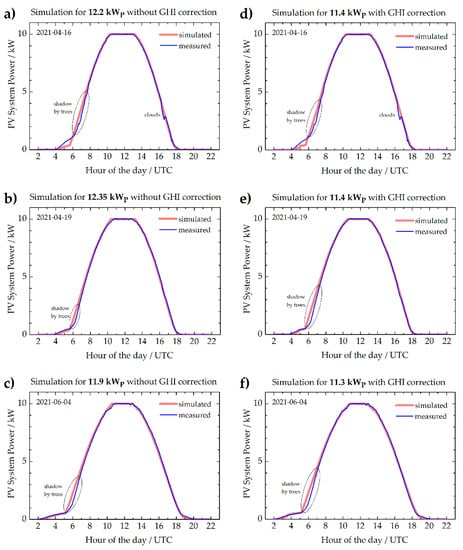 Figure 4 shows the simulated power compared to the power measured over three sunny days without incident angle modifier. For every day, a nominal power of the PV system was chosen which fit the measurement. The simulation used temperature and wind speed during these days as input data. In a first attempt, the irradiation was simulated using the clearsky model of pvlib python (Figure 4a–c). This led to a system peak power of 12.2, 12.35, and 11.9 kWp, as best fit of the simulation to the measured system power. Then, a correction factor (measured GHI/simulated GHI) was applied to the simulated system power before determining the best fitting system peak power (Figure 4d–f). On average, the system peak power was found to be 12.15 kW without using a GHI correction and 11.4 kW, including measured GHI data. This means that the correction with measured GHI data reduced the obtained system peak power of that system by 6.9%. Using the GHI correction also minimized the scatter between the three days. However, this may overestimate the diffuse light at the PV system if surrounded by other buildings.