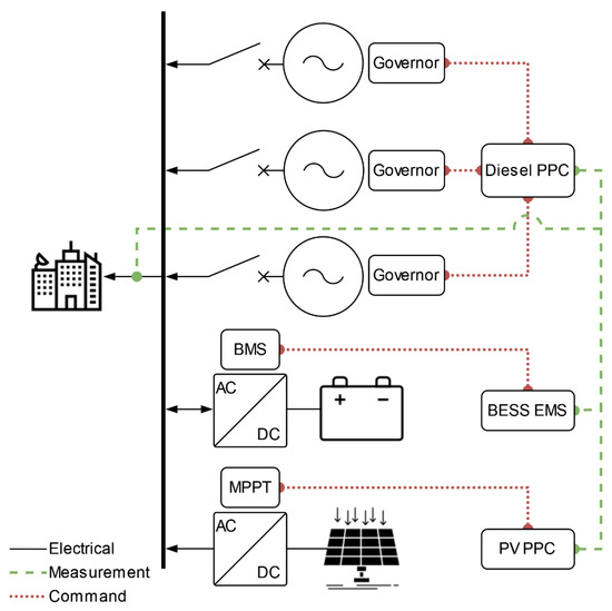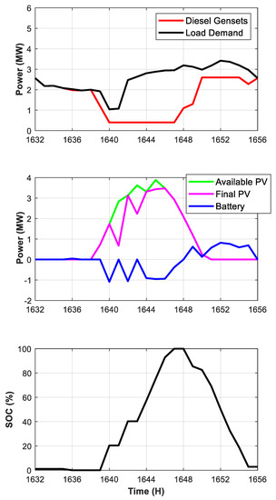 This set of rules is equivalent to minimizing the operating costs considering that diesel has the highest marginal cost, followed by BESS and PV. In this case, the economic value of the energy stored in the BESS is always constant. The energy is not saved for future use when it is more valuable; instead, it is stored and used as soon as the dispatch priority conditions are met. The priority EMS strategy is implemented using two local controllers: a diesel controller and a joint PV–BESS EMS controller. Communication between these two controllers is minimized to increase robustness. The only communication requirement is that the PV–BESS EMS controller needs the current diesel-generated power and number of running gensets as inputs. A degraded suboptimal operation mode can be implemented to guarantee system stability if the communication link between the controllers is down.