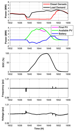 Figure 5 also includes the grid frequency and voltage profile which shows a frequency drop when the diesel gensets 2 and 3 are turned off at sunrise (at t = 1638 h and 1639 h) and a frequency rise when the diesel gensets 2 and 3 are turned on at sunset (at t = 1649 h and 1651 h). Those events also produce a disturbance in the voltage as shown in the figure.