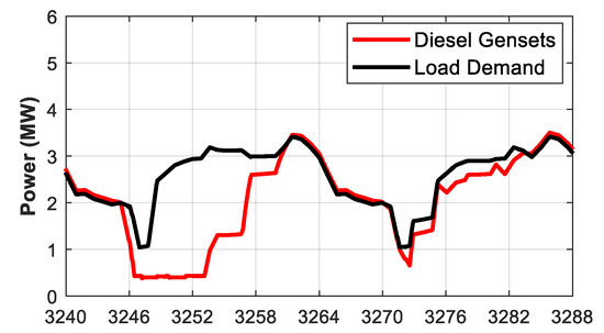 In week 9 (Figure 5 and Figure 6), the optimal EMS strategy established a low discharge rate for the BESS to support the diesel gensets and not exceed the fixed spinning reserve limit to avoid turning on the next diesel genset. Thus, the diesel gensets ran at the spinning reserve limit longer than with the priority EMS strategy, as observed for the last hours of the day (1650–1656 h).