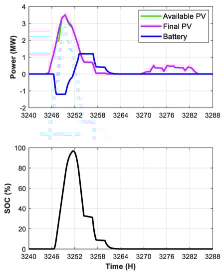 where PLoad is the load demand power, PPVF is the final PV plant power output, PBESSD is the BESS discharging power, and PBESSC is the BESS charging power.
