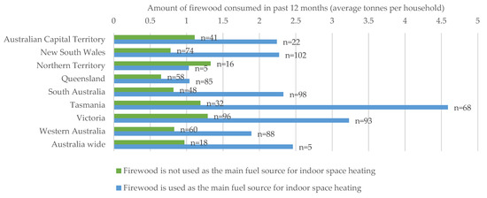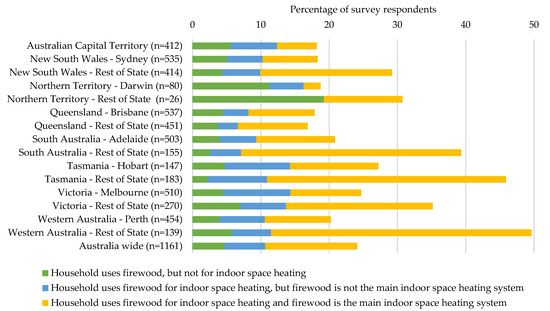 More specifically, an analysis of the survey data revealed that the proportion of firewood users varied across Australia by state/territory (i.e., location of one’s dwelling/residence), as well as by climate zone. Furthermore, consistent with overseas research [12,14], the self-reported rates of residential firewood consumption among our sample tended to be lower for respondents living in capital cities compared to those living in regional areas (see Figure 1).
