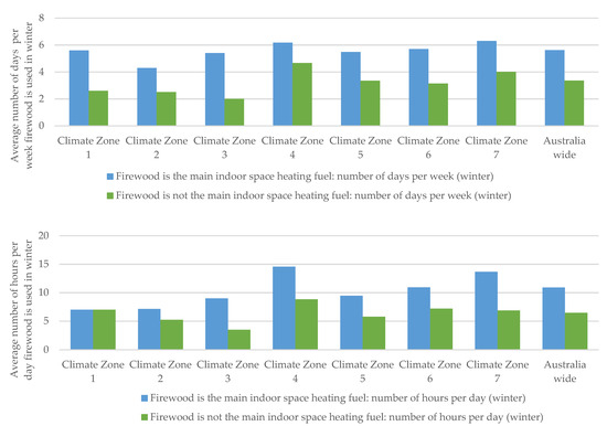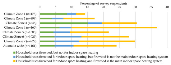 In terms of climate zone, the use of firewood for indoor space heating was significantly lower in climate zones with warmer winters (e.g., climate zones 1 and 2, which are characterised by warm winters) and higher in climate zones with cooler winter (e.g., climate zone 4, which is characterised by cool winter, and climate zone 6 and 7, which are characterised as mild and cool temperate, respectively).