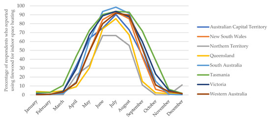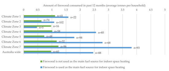 In light of Australia’s highly varied climate, it is perhaps unsurprising that the current study found geographical location to be significantly associated with residential firewood consumption. Australia is the world’s sixth largest country by total land area, with several different climate zones extending across its various states and territories. Based on climatic data from the Bureau of Meteorology, and taking into account local government areas, the country’s National Construction Code (NCC) has identified eight distinct climate zones across Australia: climate zone 1 (high humidity summer and warm winter); climate zone 2 (warm humid summer and mild winter); climate zone 3 (hot dry summer and warm winter); climate zone 4 (hot dry summer and cool winter); climate zone 5 (warm temperate); climate zone 6 (mild temperate); climate zone 7 (cool temperate), and climate zone 8 (alpine). For further details, please refer to: https://ahd.csiro.au/dashboards/energy-rating/ncc-climates/ (accessed on 16 August 2021).