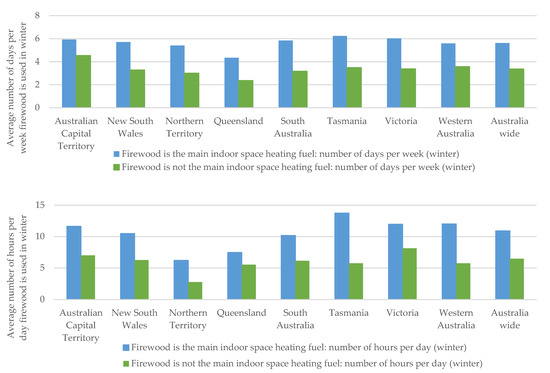 The results of these analyses revealed that when a mix of socio-demographic, dwelling-related, and behavioural variables were simultaneously included in the model, the variables that remained statistically significant (p < 0.05) included: state/territory of residence, whether or not the respondent lived in a separate house, the number of wood-fired appliances used by the household, whether or not firewood was the main energy/fuel source of indoor space heating, the timing of firewood use (i.e., number of months per year firewood was used for indoor space heating), and the frequency and duration of firewood used for the specific purpose of indoor space heating (i.e., number of days per week and hours per day) in winter.