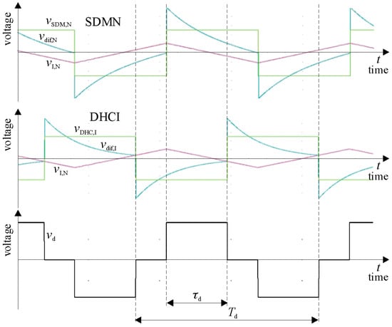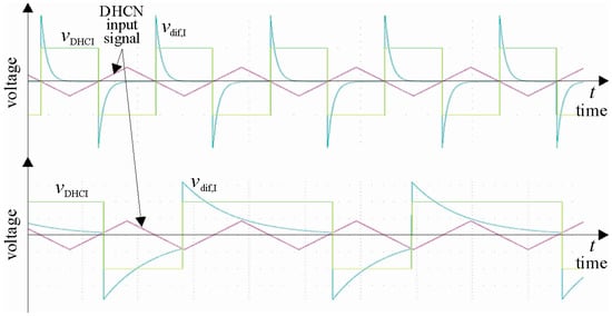 As a result of the operation of the DHCs, the pulse modulation carrier components, at the outputs of the DHCN and DHCI, are shifted in time relative to each other. This conclusion has an important impact on further considerations, related to the use of the SDMs in the proposed PVS. To illustrate the effect of phase shifting of the DHC output signal, a dedicated test circuit was used, as shown in