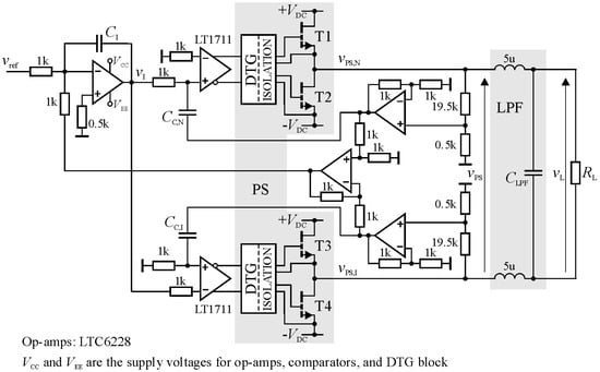 18]. This value depends on the time constant of the DHCN, meaning that this circuit is insensitive to high-frequency pulses (e.g., noise) at its input. Consequently, it is expected that this converter will be more resistant to electromagnetic disturbances, compared to a system based on a comparator with static hysteresis. As a result of most of these assumptions, the distortion in the PVS output voltage is much lower than in typical (i.e., PWM-based) converter solutions [