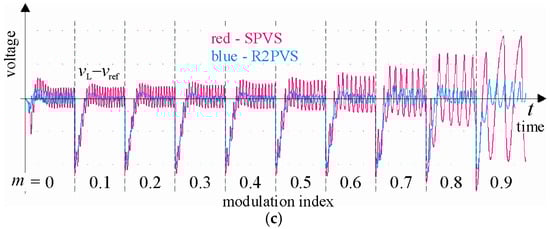 The most important factor for the operation of the converter is the relative phase shift of the and signals. For the SPVS, = 180 el. degrees, while for R2PVS, = 62 el. degrees. Thus, the RMS value of the carrier component for the R2PVS is equal to 59% of the value for the SPVS.