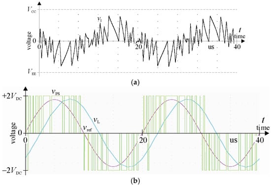 18] is presented. The basic premise of the proposed power electronics system is to obtain a precise mapping of the output voltage to the reference (input) signal. Special attention is given to minimising the energy of the ripple voltage in the converter’s output signal, which is caused by a carrier component of pulse modulation. In addition, the structure of the control block is simple, mostly analogue (i.e., no typical digital components are used in the SDM), and can be easily implemented in power electronics devices, in which a high-quality output quantity (voltage, current) is necessary. Similarly to the case of SDMs with a static hysteresis comparator, the output signal of an SDM-DHC is also both pulse-width- and pulse-duration-modulated (PWM and PDM, respectively) [