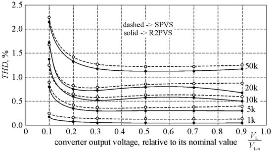 20]) factor of the output voltage, for both converters. In this case, the amplitude of the sine-wave reference signal varies between 10% and 90% of its nominal value. To determine the
