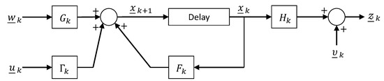 With the state vector at time k, a known input and the state noise. Equivalently, the observation vector and the observation, or measurement, noise. is the state transition matrix, is the matrix relating the states to the input and is the matrix relating measurements to states at time k, all of them with the appropriate dimensions. Figure 1 illustrates a block diagram for the signal model with external known input that corresponds to the DSE problem.