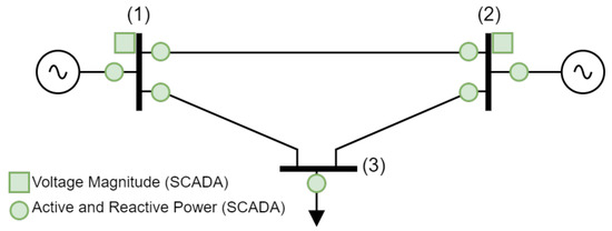 This section presents the initial simulation with a 3-bus test system, illustrated on Figure 3, as a conceptual example. The network data and reference loading scenario are provided in Appendix B. This simulation intends to show two main aspects of DSE in power systems, and the importance of supporting the algebraic state variables with the state-space model.