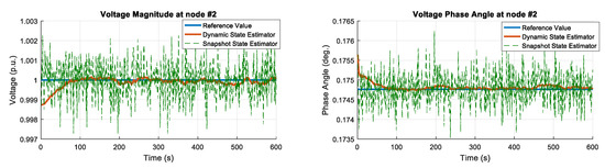 In this test, the simulation consists of a stationary load condition under 10 min, with samples acquired at each second, to illustrate the asymptotical behavior of the Kalman Filter in comparison with traditional static state estimation, that is neglecting temporal relations among state variables. Figure 4 illustrates the state variables at bus #2 during the simulation. It illustrates the major conceptual enhancement of dynamic state estimation algorithms, an asymptotical improvement of the estimated values over time. Such advantage is valid under stationary conditions, as shown in the next simulations.