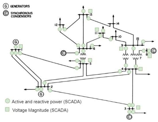 The IEEE 14 bus transmission system and respective measurement set for the simulation.