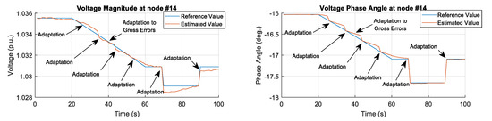 As one can see from the figures, when anomalies occur in the system, the estimation process deteriorates, especially for the phase angle. This is though expected, as, during such events, the hypothesis that the state transition matrix is equal to an identity matrix becomes false, that is, there is a change in the stationarity level of the system. Moreover, the proposed adaptation strategy successively identifies and adapts the estimator to each change on the stationarity level and in the presence of gross errors.