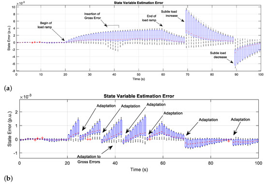 Boxplot of estimation error in all state variables at each instant of the simulation: (a) conventional Kalman Filter; (b) proposed Adaptive Dynamic State Estimator.