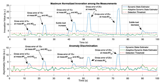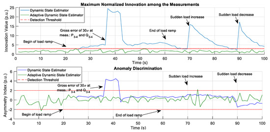 The adaptation strategy is triggered during the load ramp, at time steps #26s, #35s, #44s, and #54s. This is because the load ramp is a persistent anomaly, at that time during 40 s, which continuously changes the stationarity level of the system behavior during that interval. That said, the sudden load change (load increase and load decrease) are sudden changes that occur in a single instant, at time step #70s and #90s. In this case, the anomaly needs to be suppressed only once, in the instant of the load change, and the dynamic state estimator will return to the correct and new stationary level in a normal way. Figure 8 illustrates maximum absolute innovation value from all measurements and the calculated asymmetry index, in each instant.