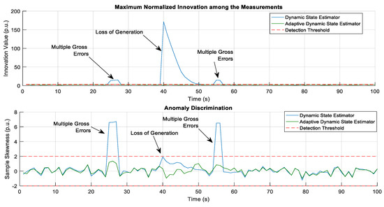 In this work, two types of anomalies are considered, that is, the sudden change of system states and measurement gross errors. Considering the measurement value , in a measurement gross error condition, the predicted state value will present significant errors in the innovation Equation (16) [10,25].